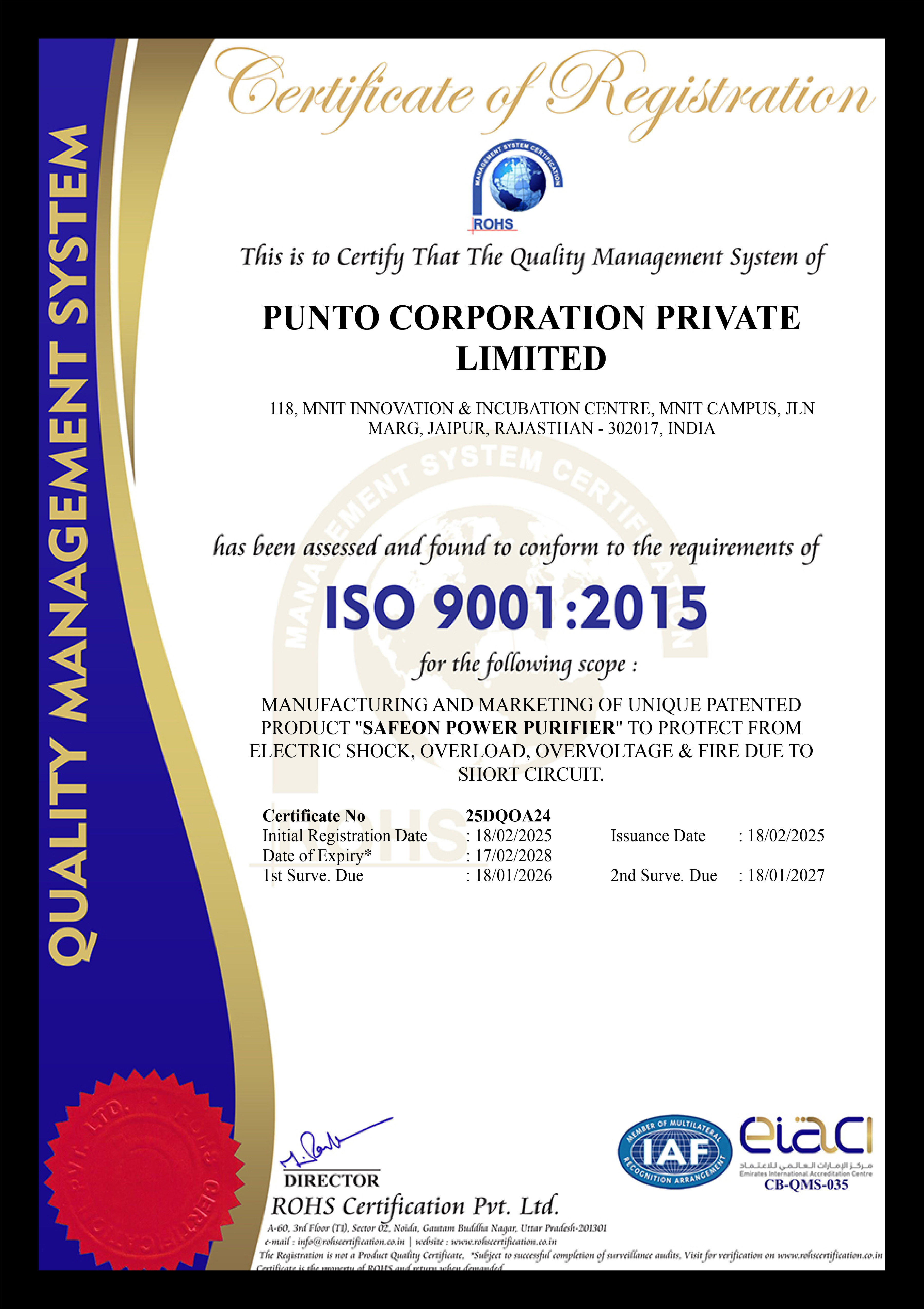 SAFEON Power Purifier offers full protection against electrocution, protect assets against the devasting effects of electrical fires.
